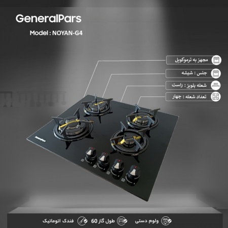 اجاق صفحه ای ترموکوپل دار جنرال پارس مدل NOYAN-G4  از سری جدید اجاقهای جنرال پارس می باشد که با قطعات با کیفیت و ضمانت داوام و عمر محصول بصورت مستقیم با قیمت رقابتی عرضه شده است.این محصول مجهز به ترموکوپل و فندک اتوماتیک بوده و از سر شعل های بهینه سوز بهره می برد شیشه این محصول سکوریت مقاوم تا 600 درجه حرارت و آنتی شوک می باشد.جنرال پارس با شبکه گسترده خدمات خود در سراسر کشور و کیفیت و قیمت رقابتی تلاش در جلب رضایت هرچه بیشتر مصرف کنندگان دارد.